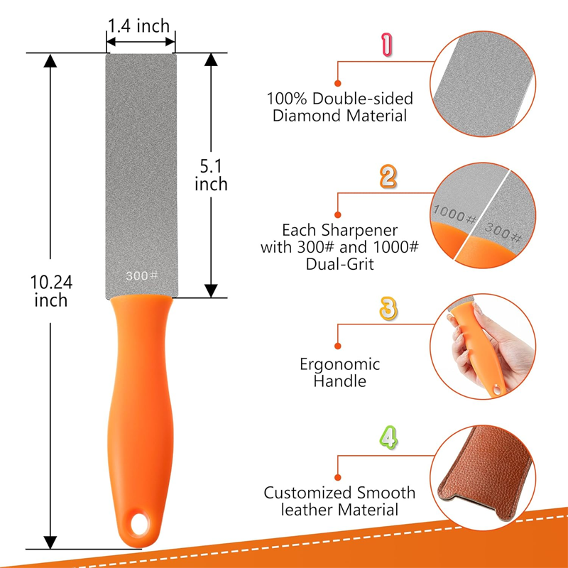 Coarse grit 300#/Ultra-fine grit 1000#, with leather sheath, suitable for gardening knives, axes, lawnmower blades, scissors, chisels, and shovels (orange), perfectly meeting the needs of gardening enthusiasts. This product is a general household product and does not include any patented design licenses