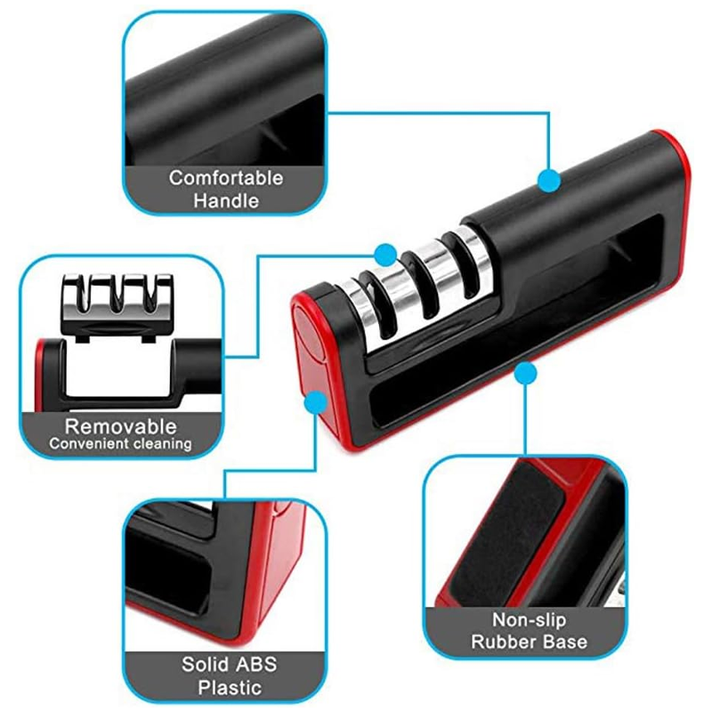 A three-section manual kitchen knife sharpener with tungsten steel, diamond grinding, and ceramic whetstones. Suitable for sharpening various knives, it’s easy to use and an ideal tool for every household, ensuring your knives always stay sharp. This product is for general household use and does not include any patented designs or licenses.
