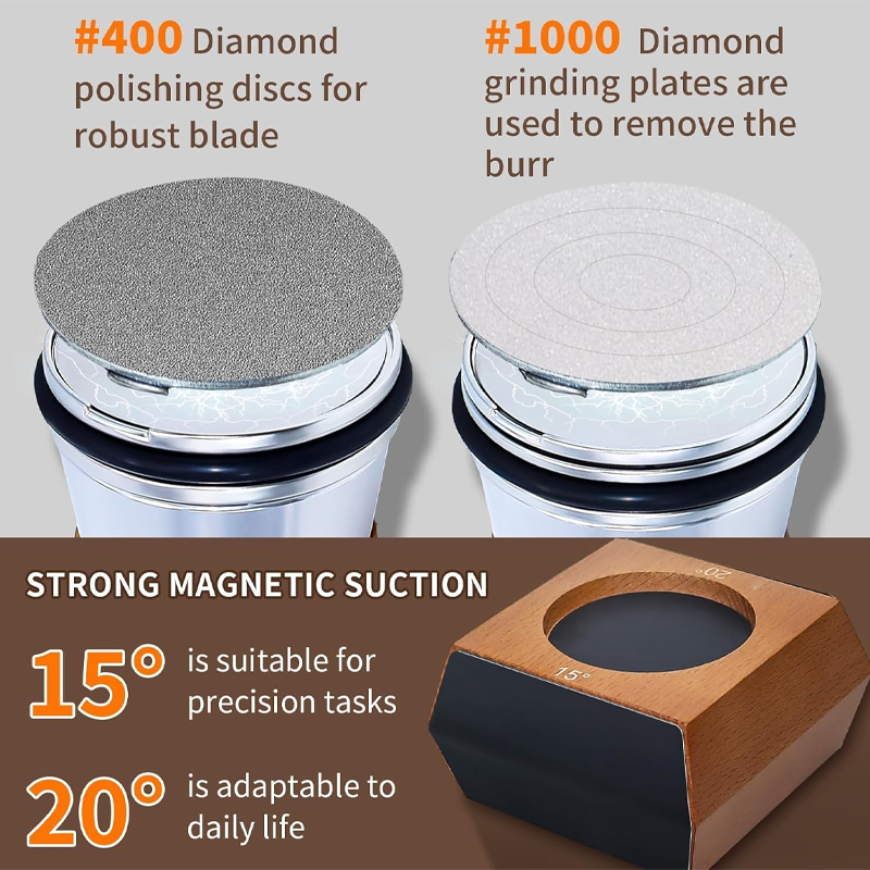 Equipped with diamond and ceramic grinding discs, featuring 15° and 20° magnetic angles, suitable for kitchen folding knives of various hardness, easily polishing them. Includes a large magnetic pad for convenient use. This product is a general household product and does not contain any patented designs or licenses.