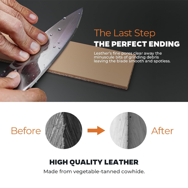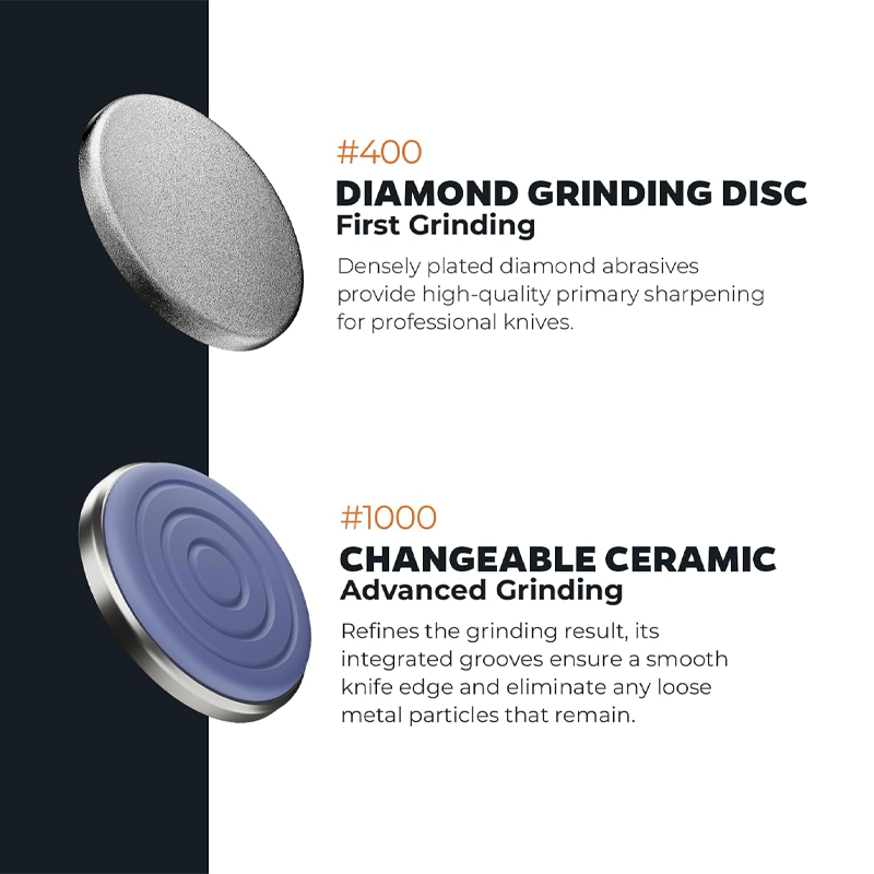 A premium sharpening set including a 400-grit fine whetstone, a 1000-grit diamond grinding disc, a ceramic grinding disc, and a leather sharpening strap, providing a professional and comprehensive knife maintenance solution. This product is for general household use and does not include any patented design licenses.